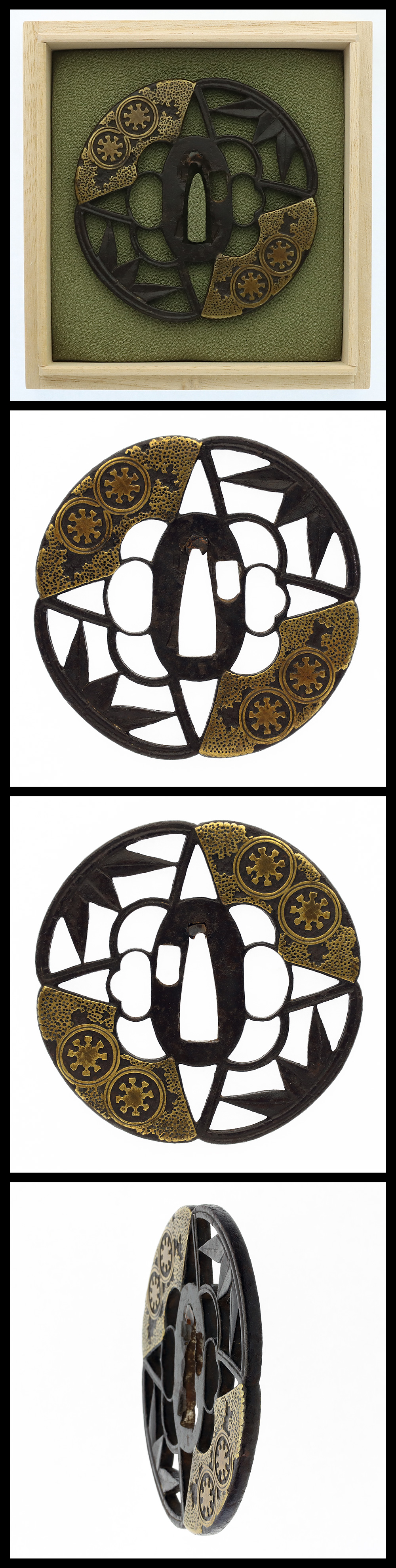 特徴:四つ木瓜型の鉄地に笹葉と扇子の図を彫り、真鍮色絵をする。