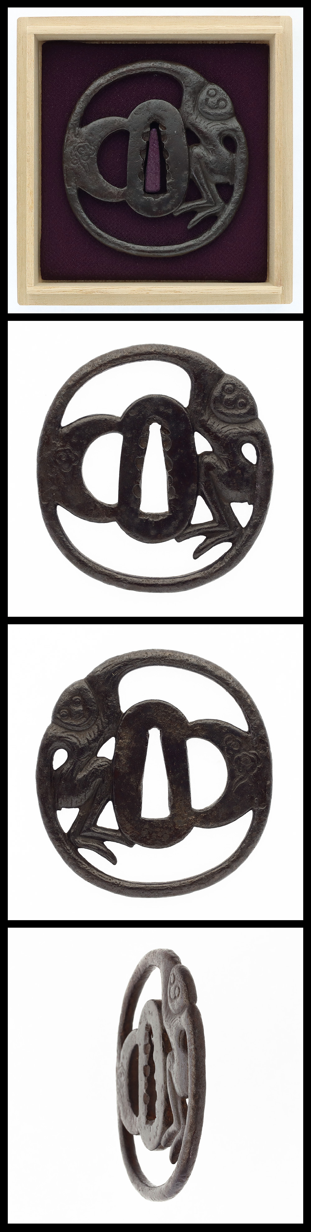 時代:江戸時代 特徴:変形の鉄地に猿猴捕月図を肉彫り透かす。