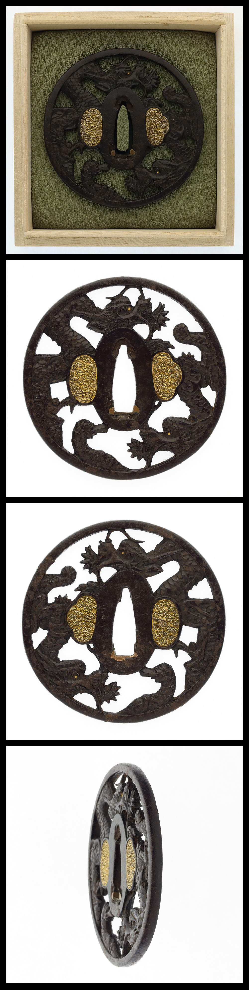 時代:江戸時代 特徴:円形の鉄地に龍の図を透かし彫る。