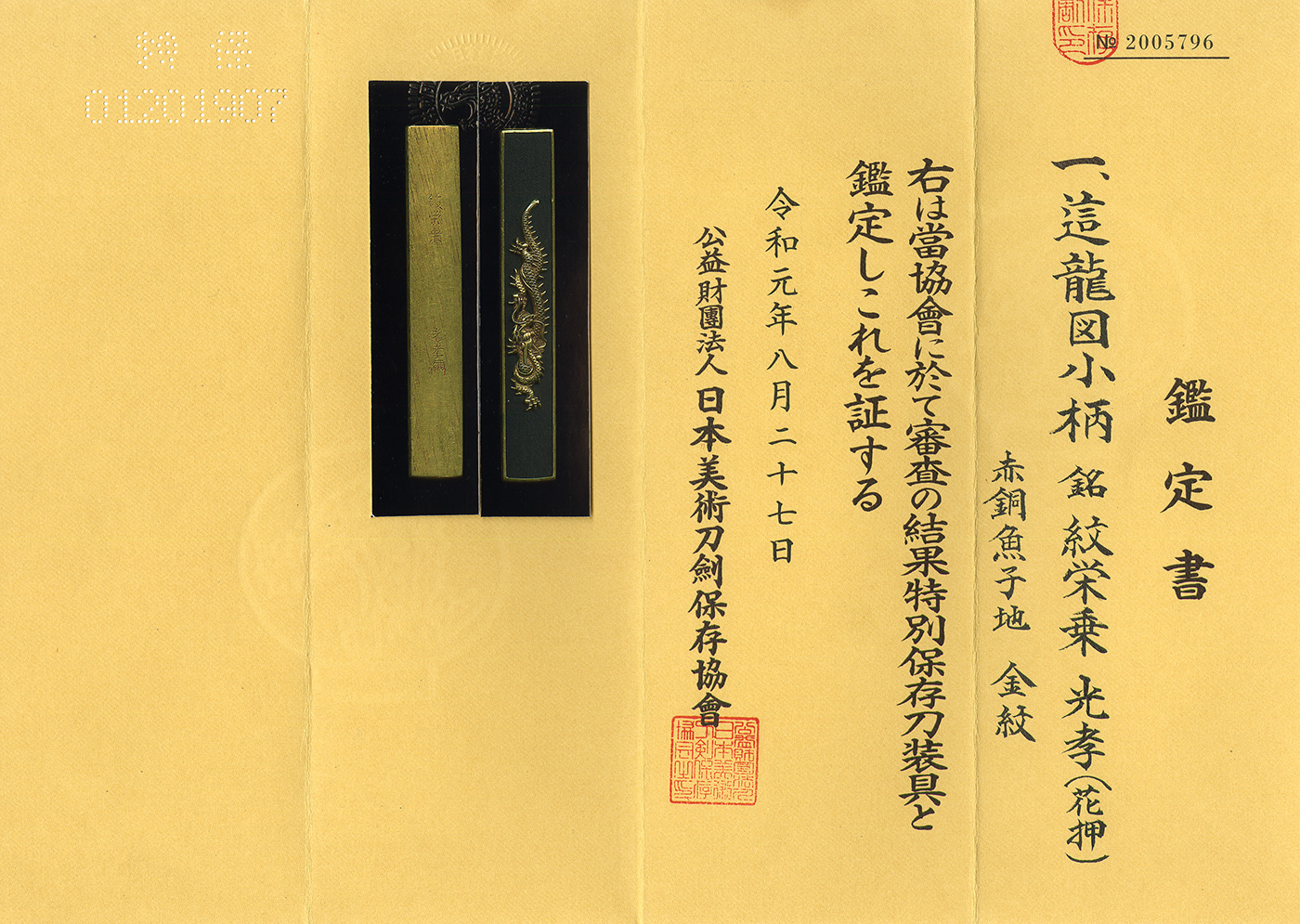 小柄:這龍図(特別保存刀剣) 銘:紋栄乗 光孝(花押)