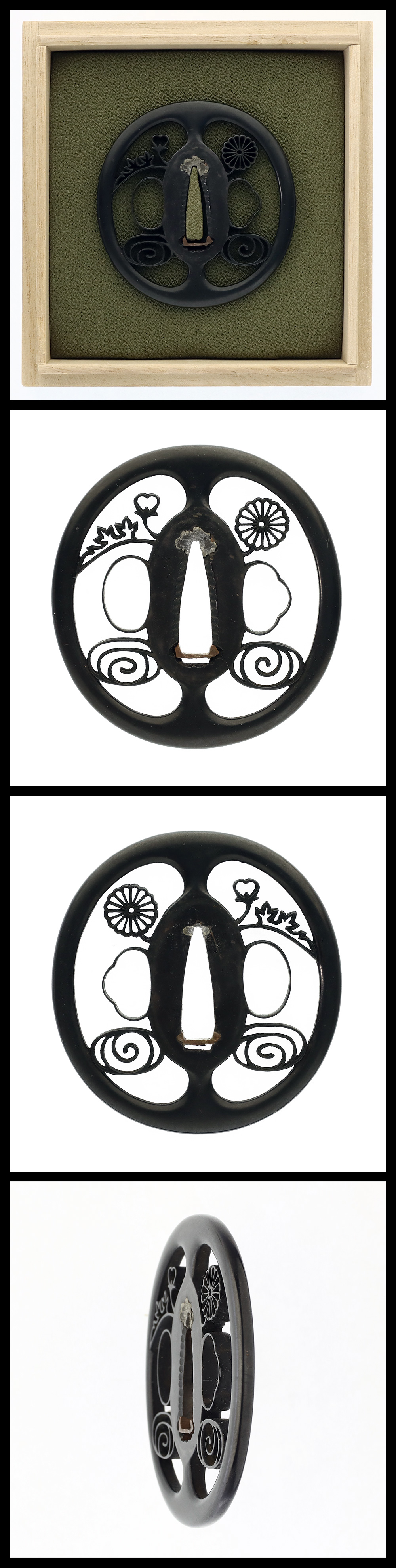 時代:江戸時代 特徴:竪丸型の赤銅地に菊花などの図を透かし彫る。