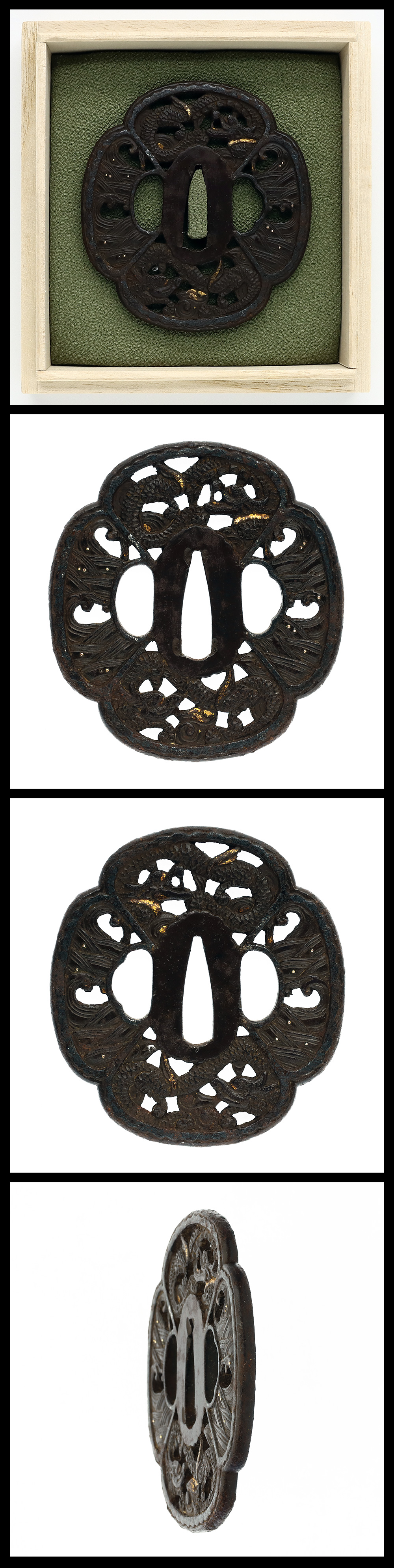 時代:江戸時代 特徴:縦木瓜型の鉄地に龍の図を透かし彫り、金象嵌をする。