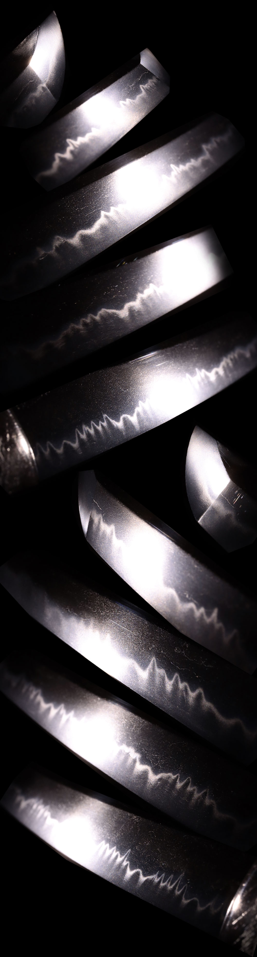 刃紋:小沸出来、小互の目乱れとなり、足がよく働き、砂流がかかる。