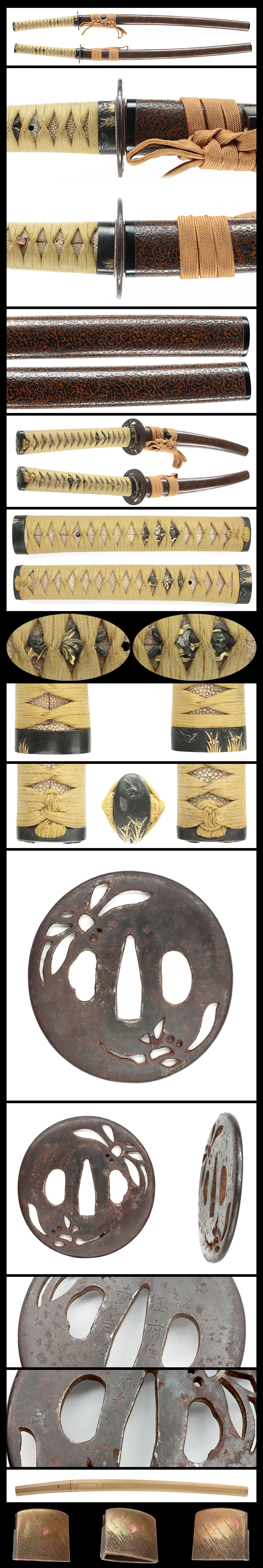 鍔:円形の鉄鐔に蜻蛉と蝶の図を透かし彫り。銘:江府住赤尾吉次。