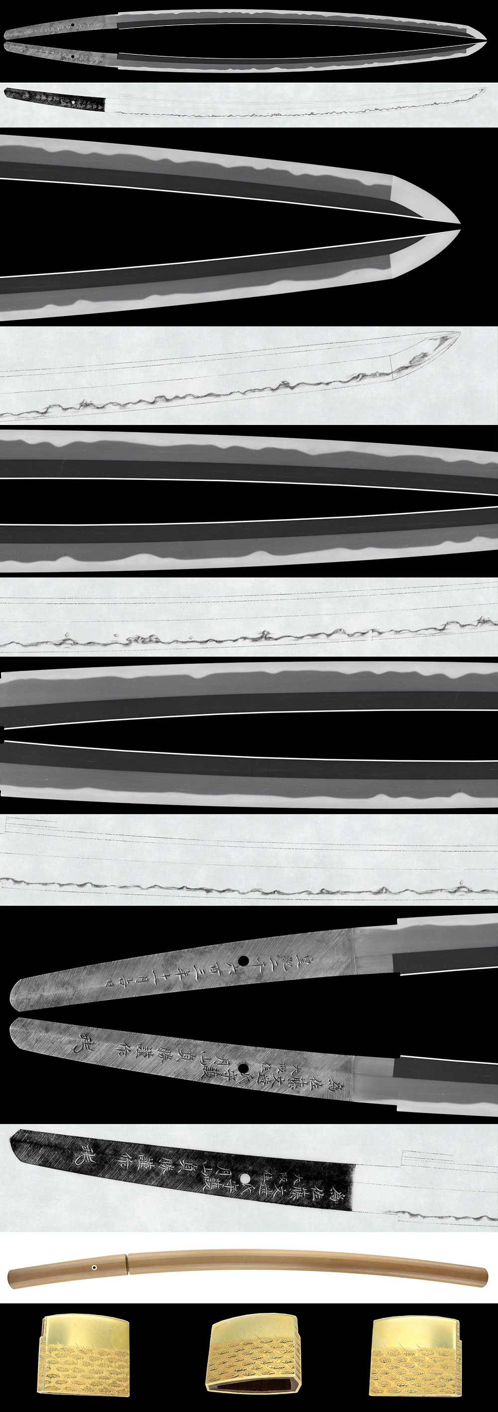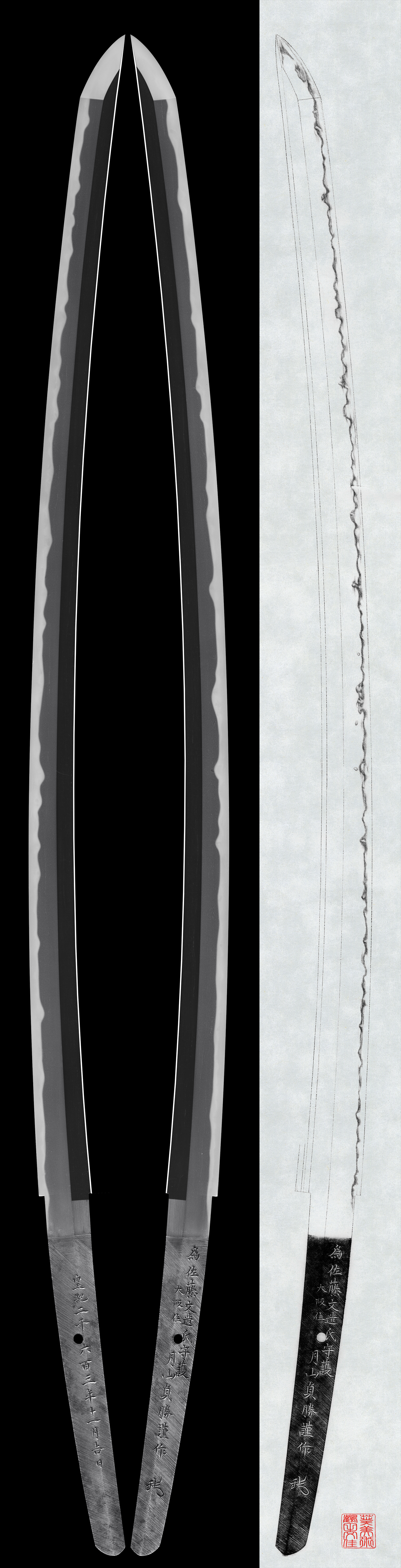月山貞勝は初代月山貞一の子で大正期から昭和初期にかけてを代表する刀工で、綾杉肌のほか、さまざまな作域を得意とした名工として知られる。本作は地鉄に柾がかかり、尖りごころの互の目乱れになるなど南北長期の美濃の古作の特徴が見られます。