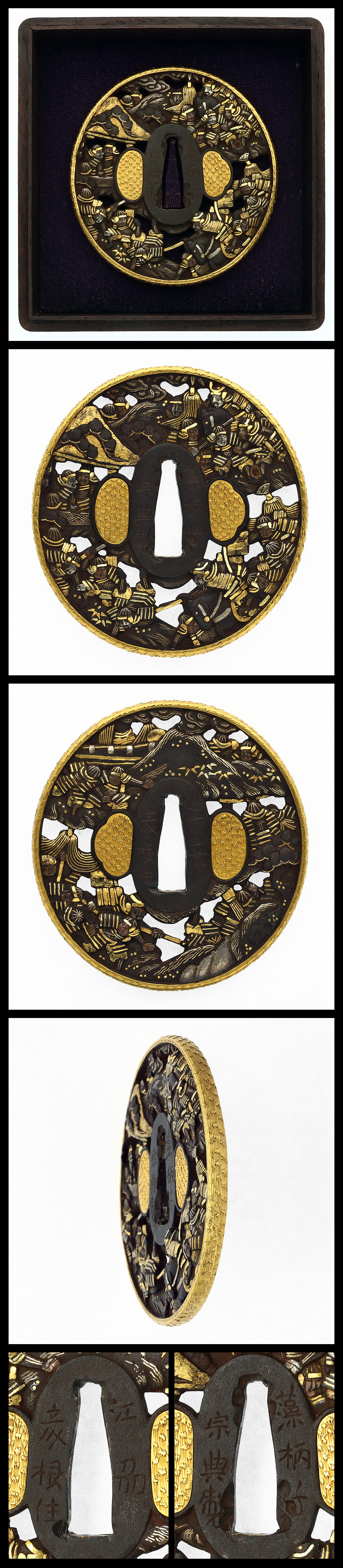 特徴:竪丸型の鉄地に合戦の図を高透かし彫り、金色絵する。