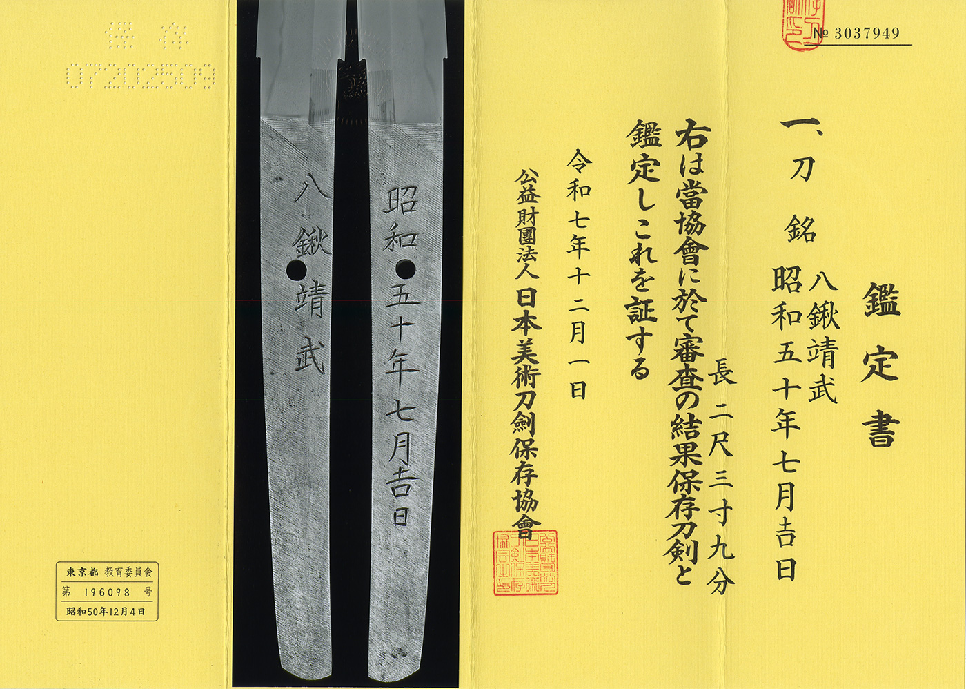 昭和19年(1944)11月に刀匠銘「靖武」を授名されるが、間もなく終戦を迎え、日本刀鍛錬会での作刀は少ない。