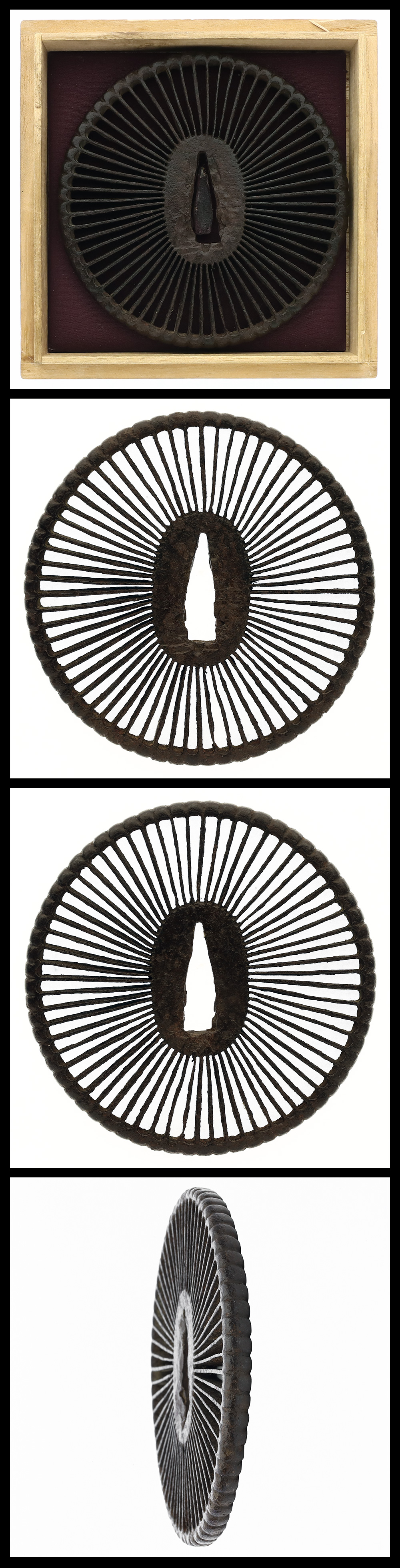 時代:江戸時代 特徴: 大ぶりの菊花形の鉄鐔に阿弥陀鑢透かしをほどこす。内側の錆が強く、透かしの一部が破損しています。