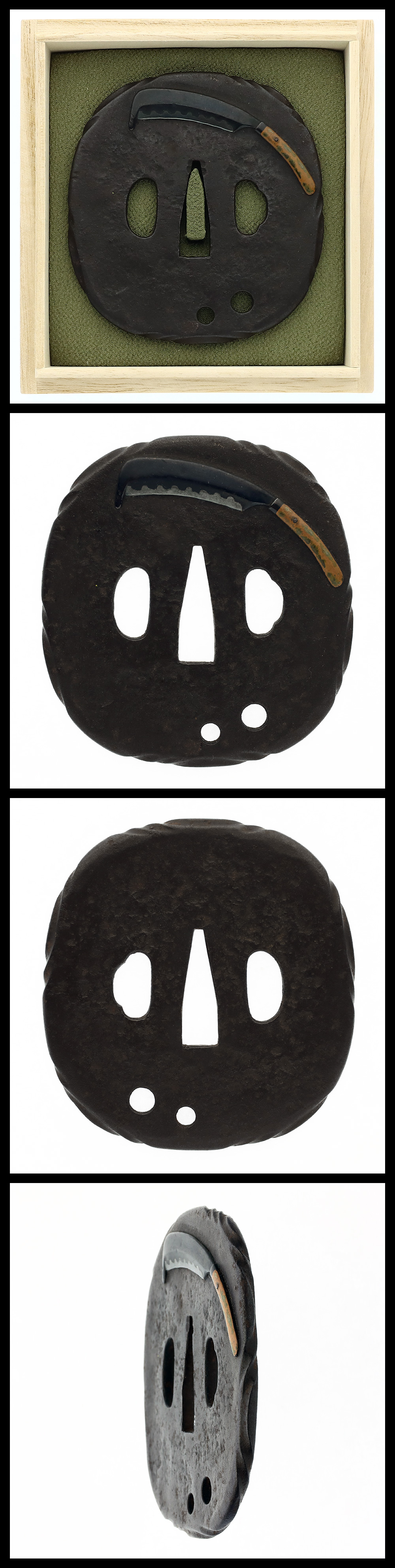 時代:江戸時代 特徴:鉄地鐔に鉈の図を象嵌でいれ、落下防止の紐を通すための小穴が開けられている。珍しい図柄の作品です。