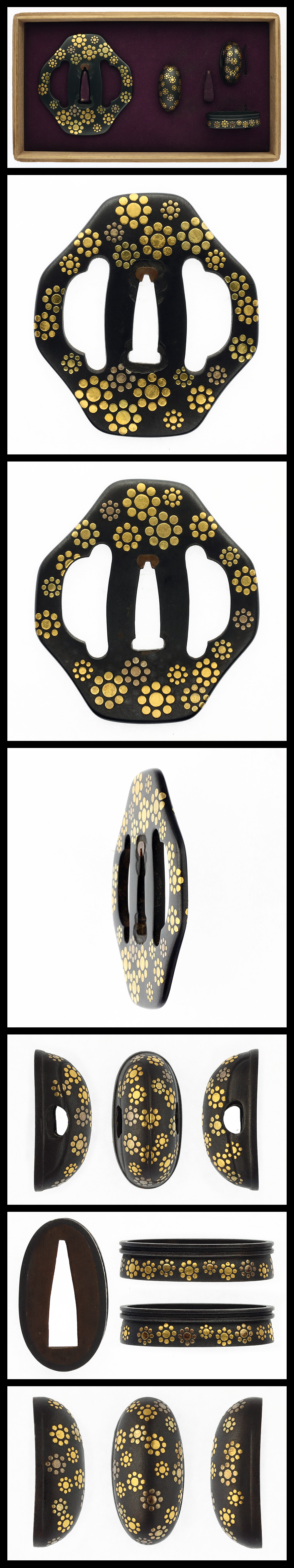 特徴:滑らかな鉄地に九曜紋を散らし象嵌色絵をほどこす。縁のサイズが大きいので身幅の広い刀にも使えます。